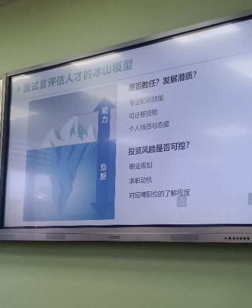 第二部分中,主讲人向学生们介绍了面试官评估人才的冰山模型,讲解了六种面试类型、面试礼仪与形象管理以及如何利用3W原则来让自我介绍与众不同。同时,主讲人还为同学们展示了各类面试问题示例,分享了破题思路。