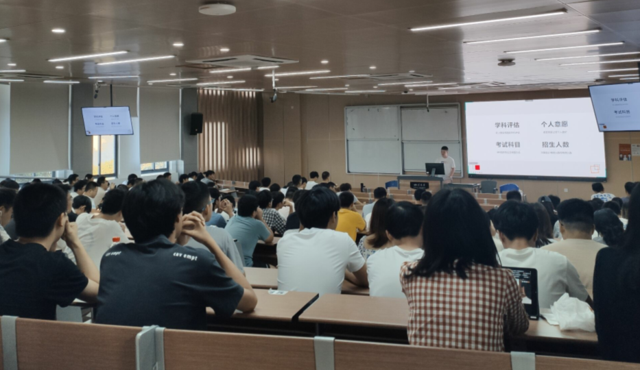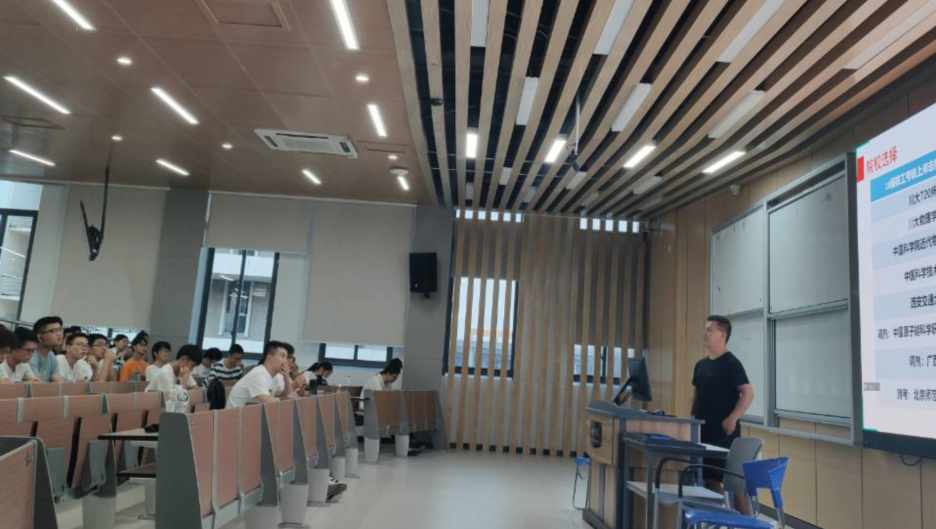 物理学专业的王耀弘学长向学弟学妹们介绍了如何选择报考的院校专业,通过现场演示的方式,悉心指导大家搜索目标院校的考研数据及相关科目的参考书目。微电子科学与工程专业的黄文德学长则结合了个人的经验侧重分享如何在准备考研过程中保持信心,如何在备考过程中保持不懈的学习动力,并鼓励大家只要坚持自己的学习目标不放弃,终究会有收获。核工程与核技术专业的张枫学长对同学们要面对的政治、英语、数学科目,给出了自己的见解,提醒同学们尽早准备,做到游刃有余。