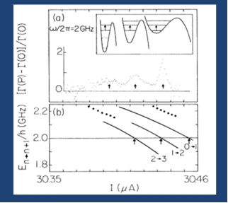 更具说服力的证据来自对宏观系统中能量量子化的直接探测。在量子力学中,束缚于势阱中的粒子具有分立的能级结构。研究团队通过向约瑟夫森结施加不同频率的微波进行探测,发现仅当微波能量(hν)恰好等于系统中两个能级之间的能量差时,系统的逃逸概率才会出现显著的共振增强如下图。这一现象表明系统从低能级被激发到了高能级。
