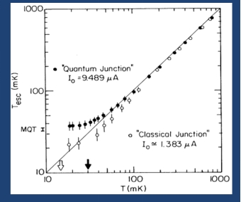 实验结果显示(图3中黑点为实验数据),当温度高于100 mK时,系统的逃逸温度与实际温度基本一致(相差一个温度无关的系数),表明此时热激发主导逃逸过程;而当温度降至37mK附近并继续下降时,逃逸温度不再变化,保持在一个稳定值,表现出类似“穿墙”的行为,这正是宏观量子隧穿(MQT)发生的标志。在该系统中,数十亿个库珀对(Cooper pairs,即超导电子对)的集体行为可由单一宏观变量——相位差来描述。实验观测到,在极低温(约30mK)下,系统能够从零电压的亚稳态通过宏观量子隧穿自发跃迁至有电压的状态。这一发现首次证实,宏观系统可作为整体表现出量子行为,而不仅仅是微观粒子行为的统计叠加。