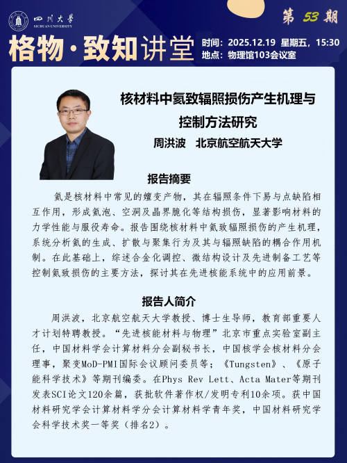 【学术报告】格物·致知讲堂第53期:核材料中氦致辐照损伤产生机理与控制方法研究