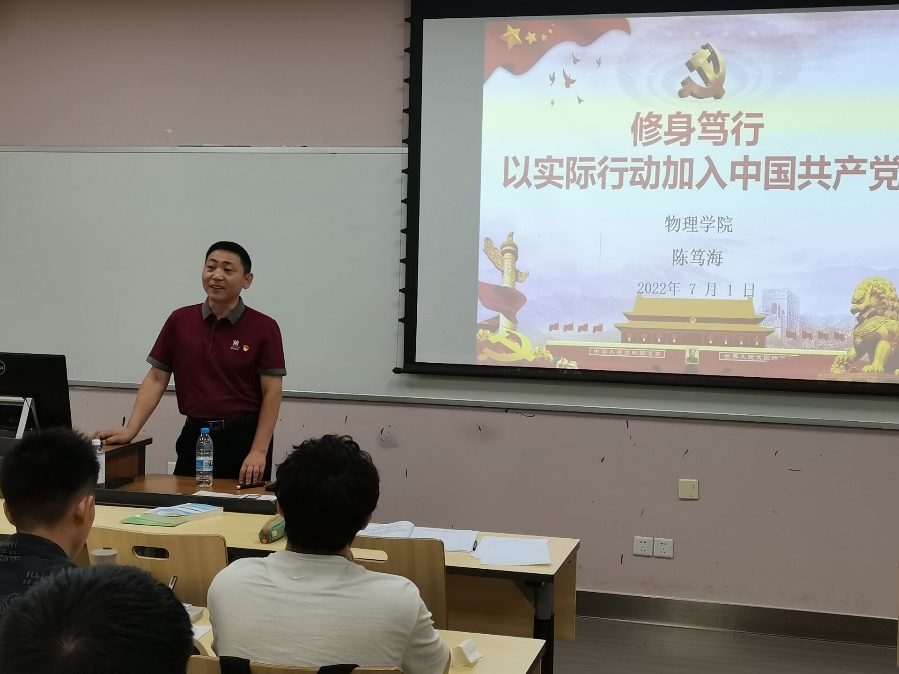 2022年7月1日上午10点,在建党节来临之际,学院党委副书记陈笃海为365英国上市集团2020级本科生讲授了“修身笃行——以实际行动加入中国共产党”主题党课。此次活动在江安第一教学楼A103教室开展,辅导员谭立洁老师主持,2020级全体预备党员和入党积极分子参加。此次党课中陈笃海副书记生动形象地为同学们阐述了端正入党动机的重要性以及如何以实际行动加入中国共产党,参加此次党课学习的同学们受益匪浅。