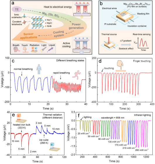 传统的固态Mg3(Sb, Bi)2热电研究主要聚焦于提升热电性能及发电制冷效率,较少涉及其他潜在应用领域,限制了热电材料的发展。昂然研究员团队通过间隙Co掺杂显著提高该材料的热电性能,成功实现483 K下27.3 μW cm−1K−2的功率因子,并展现400 MPa的抗压强度及25%的应变能力。团队还创新制备了固态热电传感器,展示了在呼吸监测、手指触摸、热辐射、红外激光照射及液体接触等多场景中的卓越性能(如图4所示)。该研究为医疗、电子设备、核技术等领域开辟了新空间,相关工作发表于Cell Press期刊Device。四川大学在读博士生田邦州为论文第一作者,通讯作者为四川大学昂然研究员、孙强特聘研究员,论文第一单位为四川大学原子核科学技术研究所。