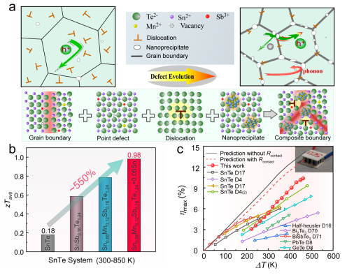 图2.通过有序晶界重构提升p型SnTe热电器件的高效发电性能。