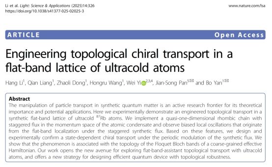 近日,四川大学365英国上市集团潘建松研究员与浙江大学、中国科学技术大学等单位的合作者在Nature出版集团旗下顶级光学期刊《Light: Science & Applications》(中科院一区,近五年影响因子23.1)上发表了题为“Engineering topological chiral transport in a flat-band lattice of ultracold atoms”的研究论文。该研究在超冷原子实验中实现了一种基于平带局域效应的拓扑手性输运机制,为拓扑量子器件的设计提供了新思路。浙江大学李航和梁茜博士为共同第一作者,潘建松研究员与浙江大学颜波教授为共同通讯作者,中国科学技术大学易为教授为重要合作者。