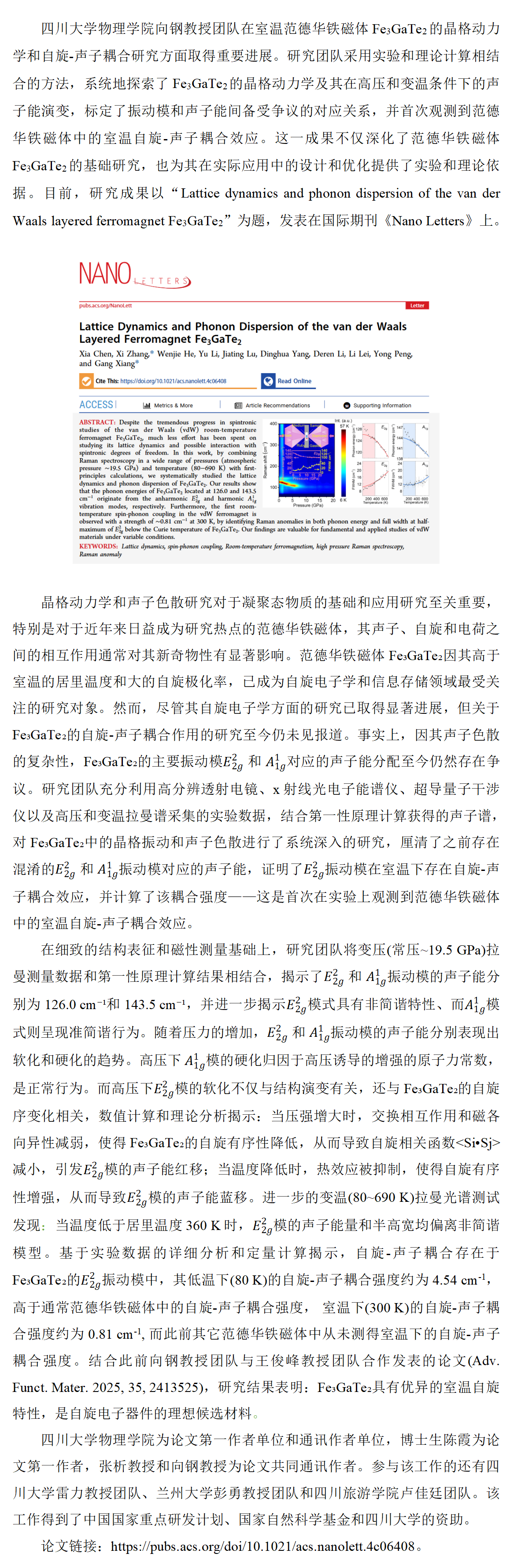 四川大学365英国上市集团向钢教授团队首次观测到范德华铁磁体中的室温自旋-声子耦合效应